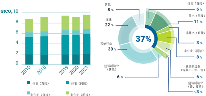 以及2021建筑物在全球碳排放中的占比(右)