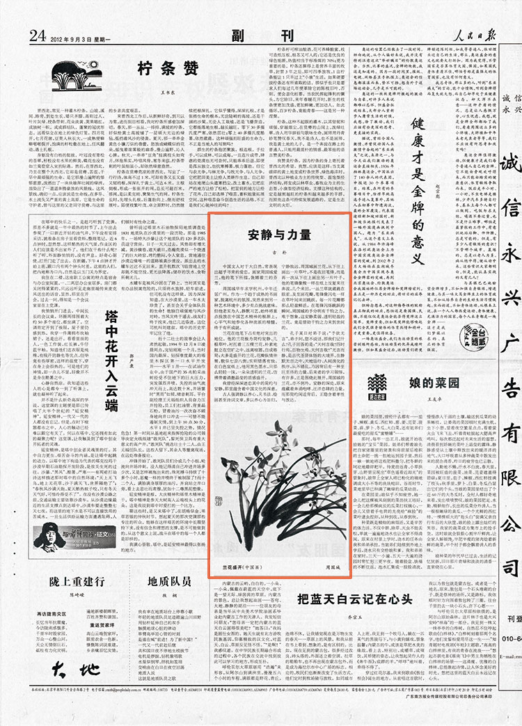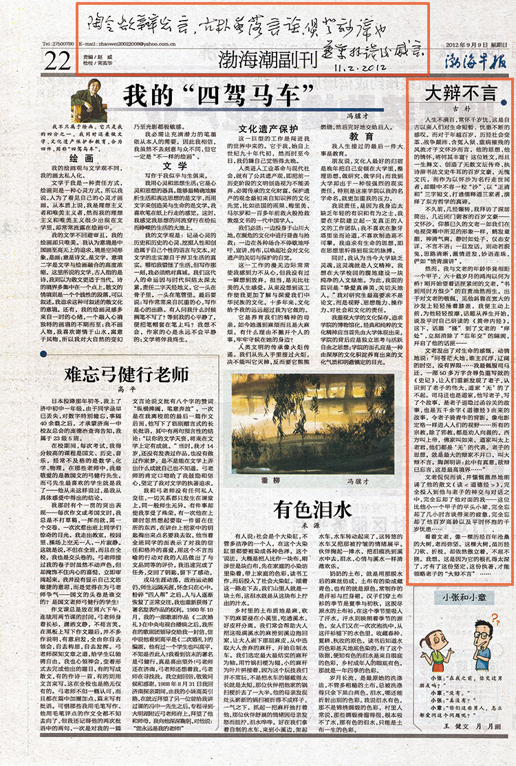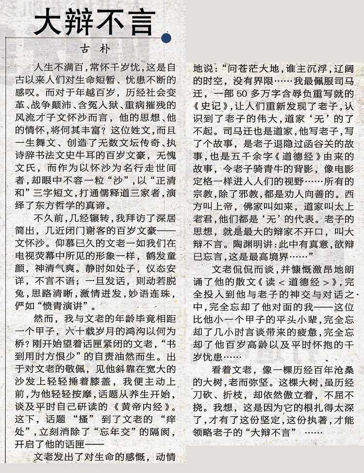 文章《安靜與力量》刊登在 9 月 3 日的《人民日報》副刊,文章《大辯不言》刊登在 9 月 9 日的《渤海早報》副刊。兩篇文章分別是古樸先生對文化名人周國城先生、文懷沙先生及其相關作品和思想的見解與感受。文章樸實、自然,文風純正,語言簡潔、明快,主旨明確、暢達,充分闡述了自己對中國文化的見解,表達了對中國傳統(tǒng)文化的熱愛以及對文懷沙、周國城等文化大師的崇敬。我國著名的國學大師文懷沙老先生讀完文章后親筆評價到“陶令欲辯忘言,古樸每落言詮,俱登妙諦也?!?/p>
