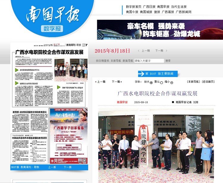 近日,廣西省級都市報《南國早報》以“廣西水電職院校企合作謀雙贏發(fā)展”為題,刊登了深圳市寶鷹建設集團股份有限公司與廣西水電職業(yè)學院共建“寶鷹建筑學院”,“現(xiàn)代學徒制”培養(yǎng)專業(yè)人才方式的相關報道。