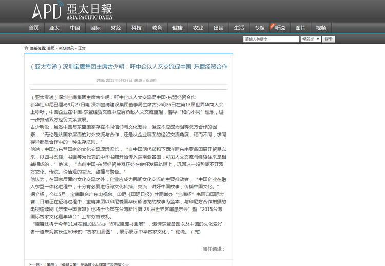 由新華社亞太總分社主辦的《亞太日報》以《深圳寶鷹集團主席古少明:吁中企以人文交流促中國-東盟經貿合作》為題,詳細報道了古少明主席在東盟區(qū)域一體化合作論壇上發(fā)表演講的主旨,并介紹了寶鷹集團以人文促進國際文化交流的實際業(yè)績。