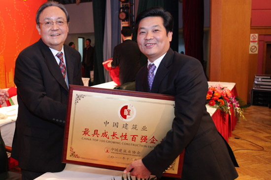 中國建筑業(yè)協(xié)會(huì)鄭一軍會(huì)長(原國家建設(shè)部副部長)向古少明主席頒發(fā)“中國建筑業(yè)最具成長性百強(qiáng)企業(yè)”獎(jiǎng)牌