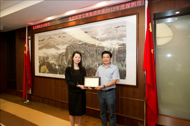 10月23日上午,羅湖區(qū)經(jīng)濟(jì)促進(jìn)局領(lǐng)導(dǎo)蒞臨寶鷹集團(tuán)公司進(jìn)行調(diào)研座談,代表羅湖區(qū)人民政府對(duì)公司在2012年度中為羅湖社會(huì)經(jīng)濟(jì)發(fā)展做出積極貢獻(xiàn)表示感謝,并向公司頒發(fā)“重點(diǎn)納稅企業(yè)”的榮譽(yù)牌匾。