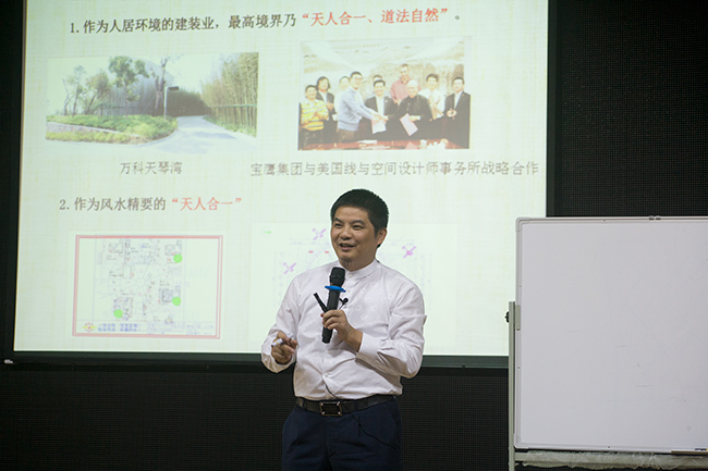 本次,來自包括寶鷹集團在內(nèi)的7位深圳裝飾行業(yè)的專家教授以及200多學(xué)員參加了為期兩天的培訓(xùn)。其中,寶鷹集團副總裁古樸為學(xué)員們帶來題為《天人合一》的精彩講座,讓學(xué)員們頓時耳目一新,掌聲不斷。講座中,古樸副總裁探討了天人合一的思想在建筑裝飾行業(yè)的現(xiàn)實意義。他介紹,建筑裝飾行業(yè)其實就是人居環(huán)境,其最高境界就是天人合一、道法自然,中國自古講風(fēng)水,似乎很神秘不可測,而天人合一正是風(fēng)水精要,風(fēng)水其實就是古人環(huán)境選擇的學(xué)問,其核心是生態(tài)環(huán)境,要求在特定的小環(huán)境內(nèi)部相互協(xié)調(diào),以達到生態(tài)環(huán)境內(nèi)部的統(tǒng)一。他還指出,天人合一的核心內(nèi)涵就是以人為本,而以人為本的最高形態(tài)正是天人合一,必須同時看到此兩面,才可謂辯證統(tǒng)一。