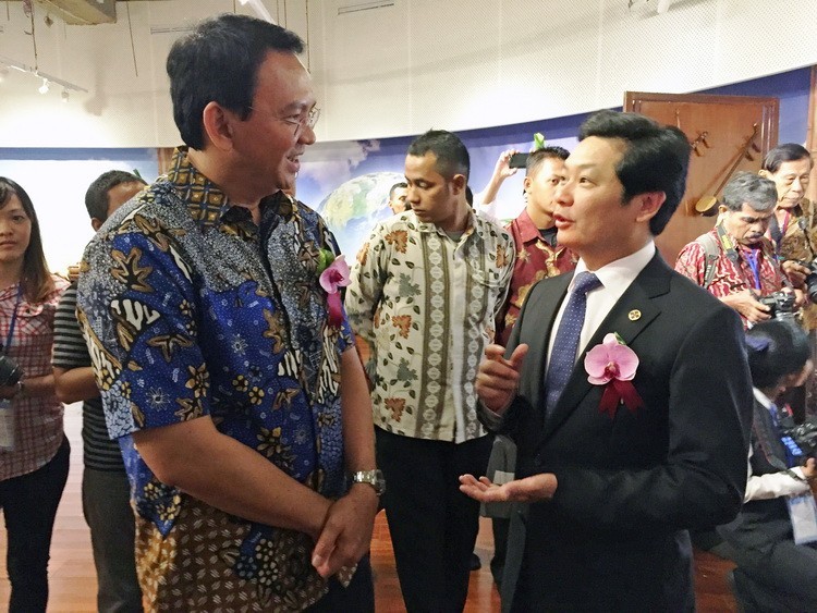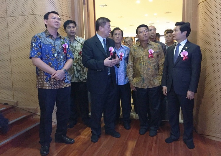 印尼慈濟(jì)基金會(huì)副執(zhí)行長(zhǎng)、印尼安達(dá)集團(tuán)董事長(zhǎng)郭再源(右三)向印尼三軍總司令MOELDOKO上將(右二)、雅加達(dá)省長(zhǎng)鐘萬(wàn)學(xué)(左一)和寶鷹集團(tuán)董事局主席古少明(右一)等介紹慈濟(jì)園區(qū)已完工的第一期項(xiàng)目