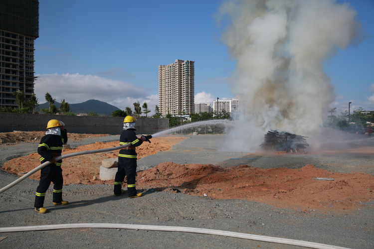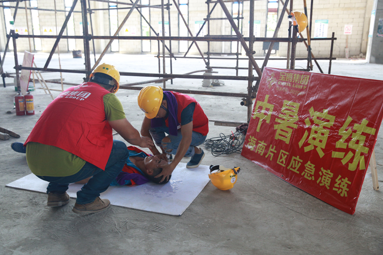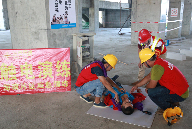 在綜合應(yīng)急演練中,演練人員分別模擬了高空墜落、觸電、中暑、火災(zāi)等工地常見的突發(fā)安全事件。在觸電事件發(fā)生后,演練人員按照正確的自救方法對(duì)傷員進(jìn)行救治,迅速報(bào)告項(xiàng)目安全人員,并撥打120急救熱線,封鎖事件現(xiàn)場(chǎng),待120專業(yè)救助人員前來救治。高空墜落、中暑和火災(zāi)各演練亦遵循其各自的特點(diǎn),在模擬實(shí)戰(zhàn)中為觀摩人員獻(xiàn)上豐富的一課。值得一提的是在滅火演練中,清水灣消防官兵不僅親自上陣為觀摩者示范消防設(shè)備的使用方法,還出動(dòng)了消防車以增強(qiáng)演練的真實(shí)感。