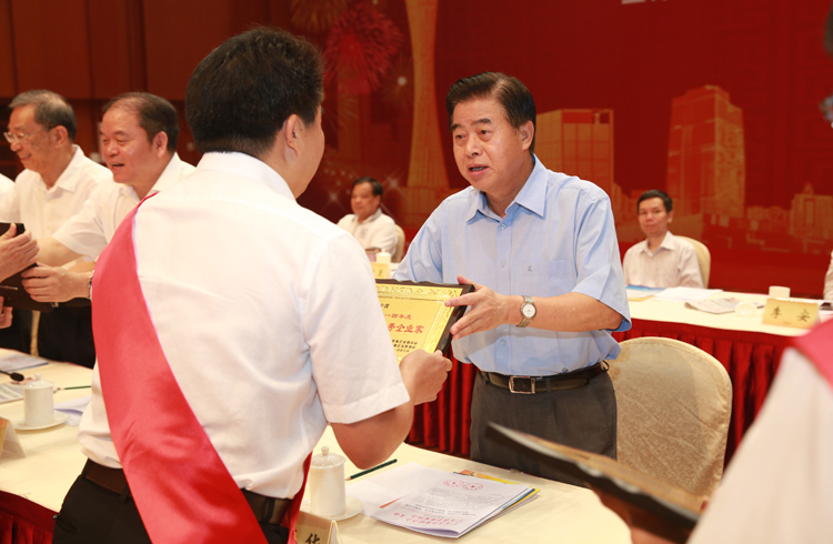 古少波董事長(zhǎng)接受廣東省優(yōu)秀企業(yè)家獎(jiǎng)牌(右為全國(guó)人大華僑委員會(huì)副主任委員、省人民政府原省長(zhǎng)黃華華,左為寶鷹股份董事長(zhǎng)古少波)