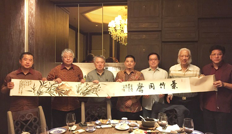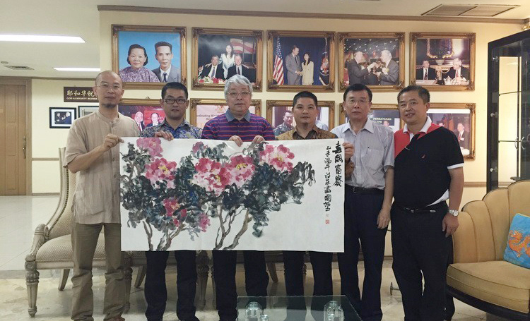 6月22日,周國(guó)城主席在古樸副總裁和印尼寶鷹工作人員的見(jiàn)證下,為印尼寶鷹題字,一起祝福印尼寶鷹事業(yè)飛黃騰達(dá)。6月23日,印尼INTILAND地產(chǎn)集團(tuán)董事長(zhǎng)吳端華設(shè)宴接待了周國(guó)城主席和古樸副總裁一行,暢敘了與寶鷹的合作情誼。周國(guó)城主席在宴席上向吳端華董事長(zhǎng)贈(zèng)送了自己的手卷作品。之后,周國(guó)城主席和古樸副總裁在熊德龍董事長(zhǎng)和吳端華董事長(zhǎng)的陪同下,拜訪了印尼國(guó)家安全部部長(zhǎng)Stiyoso,并贈(zèng)送了周國(guó)城主席的手卷作品。
