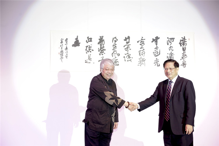 ▲謝鋒大使在古少明主席、周?chē)?guó)城主席、古樸副總裁陪同下欣賞畫(huà)展作品