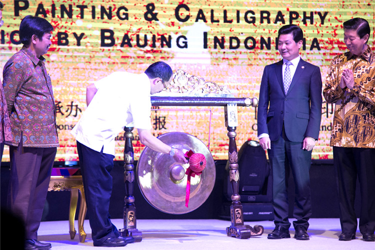 ▲印尼旅游部副部長(zhǎng)IGEDEPITANA為印尼寶鷹中國(guó)書(shū)畫(huà)邀請(qǐng)展鳴鑼開(kāi)幕
