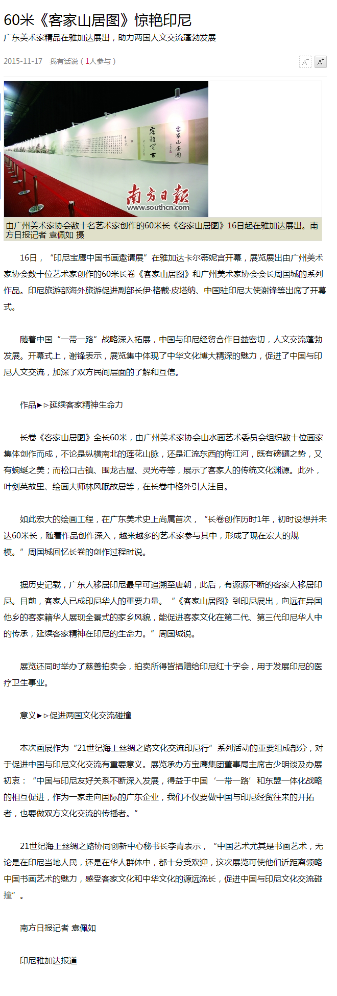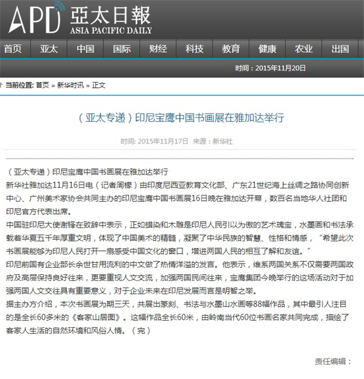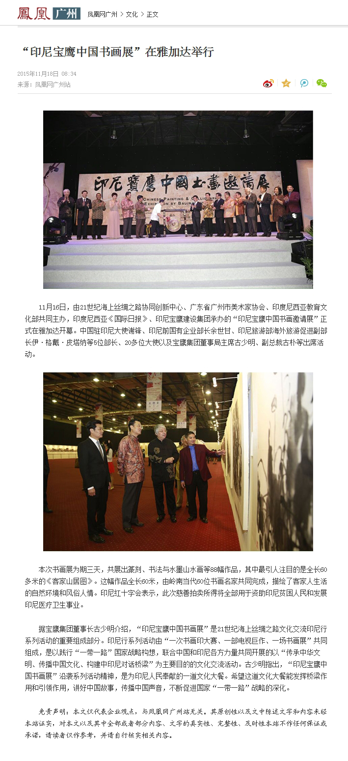 11月16日晚--18日,由21世紀(jì)海上絲綢之路協(xié)同創(chuàng)新中心、廣東省廣州市美術(shù)家協(xié)會(huì)和印尼教育文化部共同主辦,寶鷹集團(tuán)、印尼《國(guó)際日?qǐng)?bào)》承辦,印尼旅游部協(xié)辦的“印尼寶鷹中國(guó)書(shū)畫(huà)展”在印度尼西亞雅加達(dá)卡爾蒂妮宮盛大舉行。