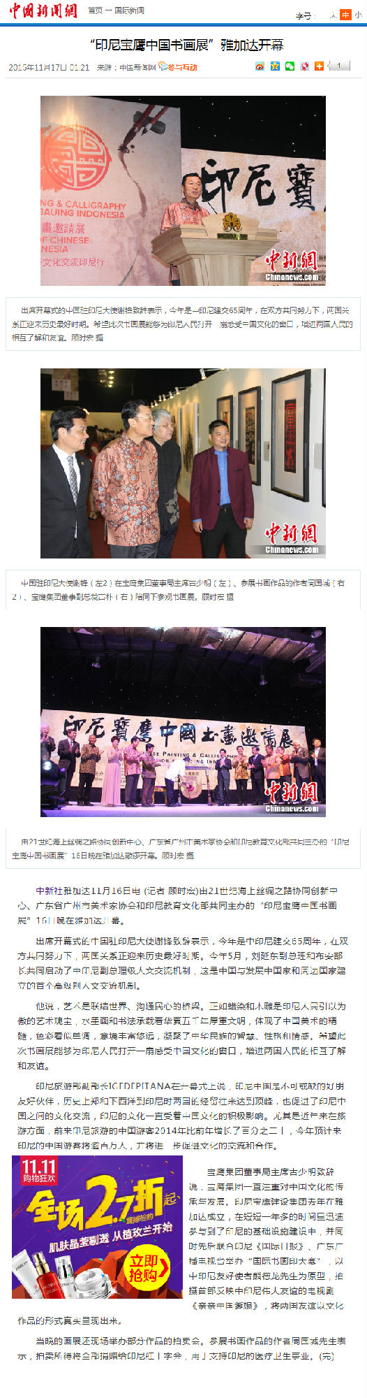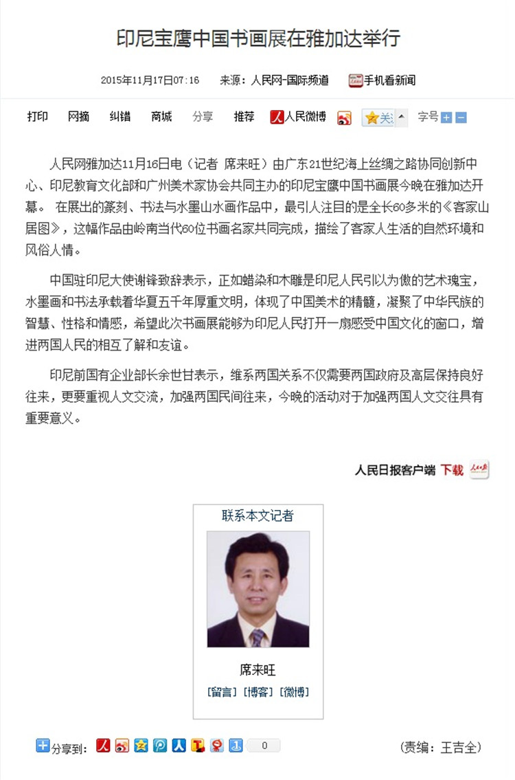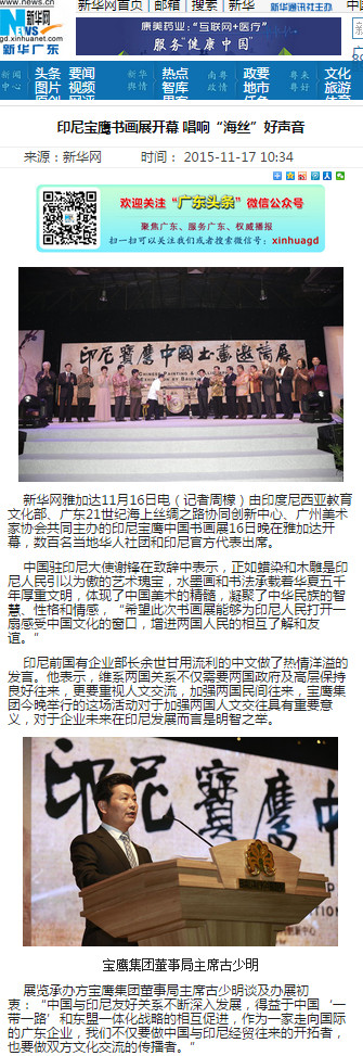 請(qǐng)點(diǎn)擊以下鏈接觀看深圳衛(wèi)視《深視新聞》欄目對(duì)印尼寶鷹書(shū)畫(huà)邀請(qǐng)展的報(bào)道: http://www.cutv.com/v2/2015-11-17/G16ghgggihkknnllhmh9g6.shtml?from=timeline&isappinstalled=0