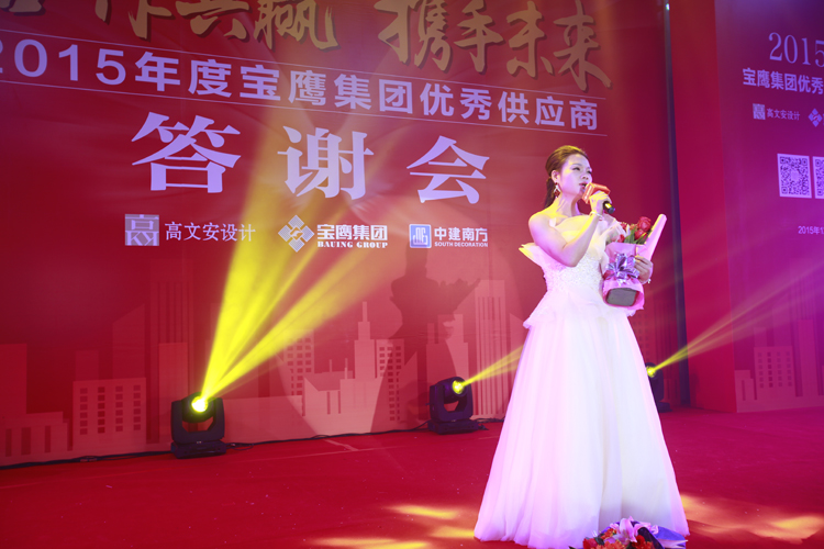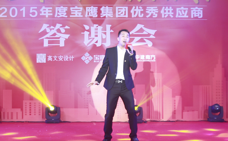 在諸位供應(yīng)商與三方領(lǐng)導(dǎo)一起舉杯,滿飲此杯時,2015寶鷹集團優(yōu)秀供應(yīng)商答謝會晚宴正式開始。一曲曲深情的歌兒唱出溫馨的祝福,一支支優(yōu)美的舞蹈跳出一個前程錦繡。熱鬧非凡的舞獅表演象征著紅紅火火,《今宵如此美麗》的曼妙歌聲讓諸位嘉賓流連忘返,《相親相愛的一家人》訴說著濃濃的情意,《大展宏圖》則傳遞出對未來的雄心壯志。參會嘉賓與諸位領(lǐng)導(dǎo)一邊觀賞著精彩的節(jié)目,一邊為友誼和新的希望舉杯,現(xiàn)場沉浸在一派活潑熱鬧的氣氛中。值得一提的是,本次供應(yīng)商答謝會加入了嘉賓點歌環(huán)節(jié),諸位嘉賓分別用歌唱表達著自己心中的喜悅,亦為此次供應(yīng)商答謝會畫上了圓滿的句號。