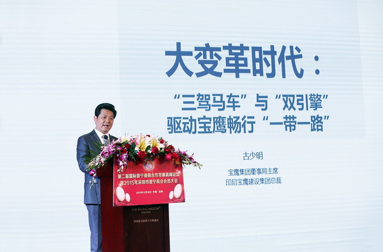 12月26日,第二屆國際普寧潮商合作發(fā)展高峰論壇暨2015深圳市普寧商會會員大會于深圳星河麗思卡爾頓酒店隆重舉行。本次大會融聚海內(nèi)外知名普寧潮商,規(guī)模大、規(guī)格高,社會各界知名人士亦有出席。中央政府駐香港聯(lián)絡(luò)辦副主任黃蘭發(fā),廣東省人大原副主任黃偉鴻,廣東省政協(xié)原副主席、統(tǒng)戰(zhàn)部長李統(tǒng)書,深圳市人大原常務(wù)副主任、深圳市商業(yè)聯(lián)合會會長莊禮祥等領(lǐng)導(dǎo)及深圳市普寧商會廣大會員出席此次大會。寶鷹集團董事局主席古少明受邀出席大會,并在此次大會上受聘為深圳普寧商會決策委員會副主席兼榮譽會長。此外,古少明主席還在第二屆國際普寧潮商合作發(fā)展高峰論壇上發(fā)表了題為《大變革時代:“三駕馬車”與“雙引擎”驅(qū)動寶鷹暢行“一帶一路”》的主題演講。