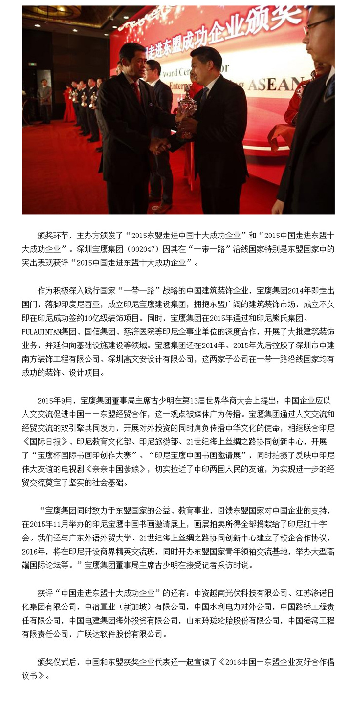 1月19日,由中國—東盟商務(wù)理事會(huì)、東盟北京委員會(huì)主辦的中國—東盟迎新春增合作系列活動(dòng)在北京舉辦,活動(dòng)上公布了2015年“中國走進(jìn)東盟十大成功企業(yè)”“東盟走進(jìn)中國十大成功企業(yè)”獎(jiǎng)項(xiàng)。深圳寶鷹集團(tuán)(股票代碼:002047)因在“一帶一路”沿線國家特別是東盟國家中的突出表現(xiàn)而獲評“2015中國走進(jìn)東盟十大成功企業(yè)”。