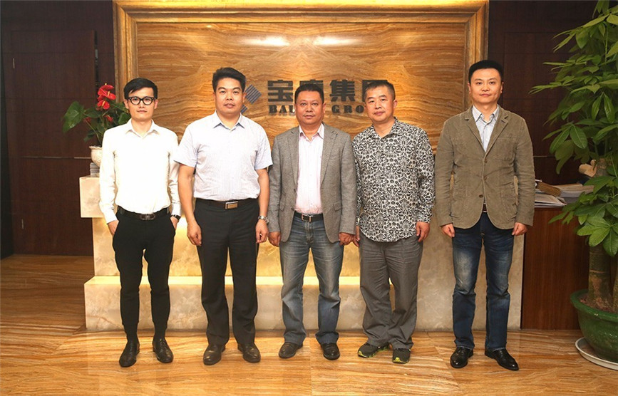 ▲中國(guó)華西企業(yè)股份有限公司廣州分公司總經(jīng)理羅征祥(中)一行蒞臨寶鷹集團(tuán),受到古少波董事長(zhǎng)(左二)的盛情接待