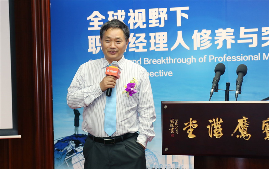 ▲ 廣東外語外貿(mào)大學(xué)商學(xué)院執(zhí)行院長 朱文忠?guī)怼度蛞曇跋侣殬I(yè)經(jīng)理人職業(yè)道德與社會責(zé)任》主題講座