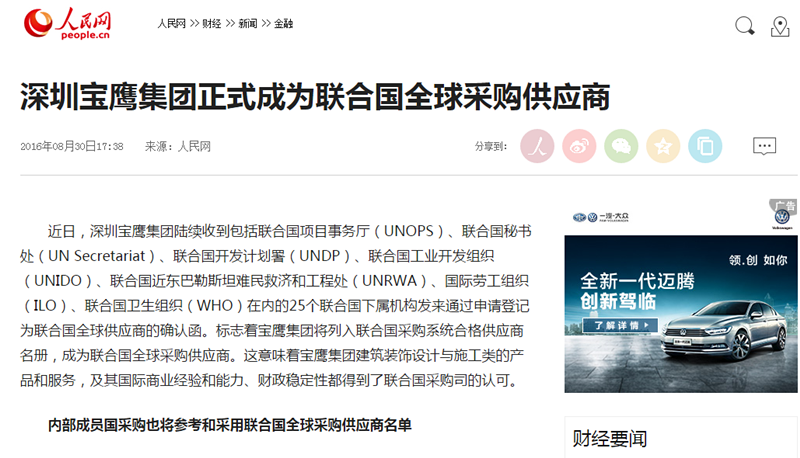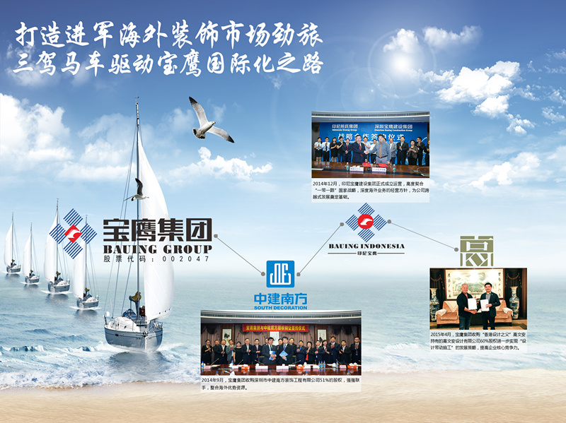 自2013年上市以來(lái),寶鷹集團(tuán)就開(kāi)始重點(diǎn)布局拓展海外市場(chǎng),并響應(yīng)國(guó)家 “一帶一路”戰(zhàn)略號(hào)召,在印尼成立印尼寶鷹建設(shè)集團(tuán),聯(lián)姻深圳市中建南方建設(shè)集團(tuán)、深圳高文安設(shè)計(jì)有限公司,深度開(kāi)拓海外市場(chǎng)。不到兩年,寶鷹集團(tuán)就在全球15個(gè)國(guó)家和地區(qū)獲得發(fā)展,今年7月,寶鷹集團(tuán)相繼在印尼、越南相繼簽署一系列建筑裝飾設(shè)計(jì)與施工大單。今年年初,寶鷹集團(tuán)還被評(píng)為“2015年中國(guó)走進(jìn)東盟十大成功企業(yè)”。深圳寶鷹集團(tuán)在全球建筑與裝飾工程服務(wù)發(fā)面的發(fā)展實(shí)力以及在國(guó)際市場(chǎng)的良好聲譽(yù)、過(guò)硬的產(chǎn)品質(zhì)量是本次入圍聯(lián)合國(guó)全球采購(gòu)供應(yīng)商的重要原因。