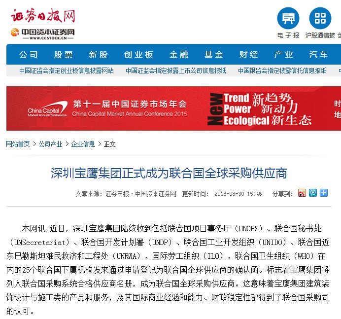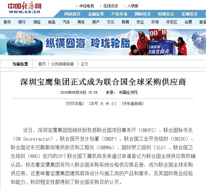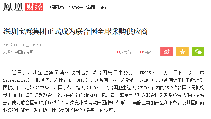 近日,深圳寶鷹集團(tuán)陸續(xù)收到包括聯(lián)合國(guó)項(xiàng)目事務(wù)廳(UNOPS)、聯(lián)合國(guó)秘書(shū)處(UN Secretariat)、聯(lián)合國(guó)開(kāi)發(fā)計(jì)劃署(UNDP)、聯(lián)合國(guó)工業(yè)開(kāi)發(fā)組織(UNIDO)、聯(lián)合國(guó)近東巴勒斯坦難民救濟(jì)和工程處(UNRWA)、國(guó)際勞工組織(ILO)、聯(lián)合國(guó)衛(wèi)生組織(WHO)在內(nèi)的25個(gè)聯(lián)合國(guó)下屬機(jī)構(gòu)發(fā)來(lái)通過(guò)申請(qǐng)登記為聯(lián)合國(guó)全球供應(yīng)商的確認(rèn)函。標(biāo)志著寶鷹集團(tuán)將列入聯(lián)合國(guó)采購(gòu)系統(tǒng)合格供應(yīng)商名冊(cè),成為聯(lián)合國(guó)全球采購(gòu)供應(yīng)商。這意味著寶鷹集團(tuán)建筑裝飾設(shè)計(jì)與施工類的產(chǎn)品和服務(wù),及其國(guó)際商業(yè)經(jīng)驗(yàn)和能力、財(cái)政穩(wěn)定性都得到了聯(lián)合國(guó)采購(gòu)司的認(rèn)可。