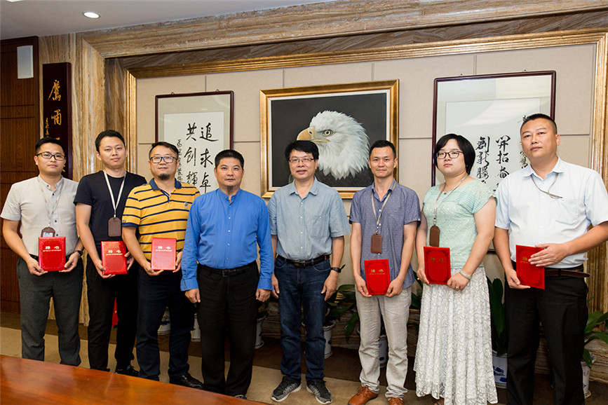 寶鷹集團副總裁古樸(左四)、廣西水利電力職業(yè)技術學院張忠海副院長(右四)與受聘為客座教授的六位寶鷹員工合影
