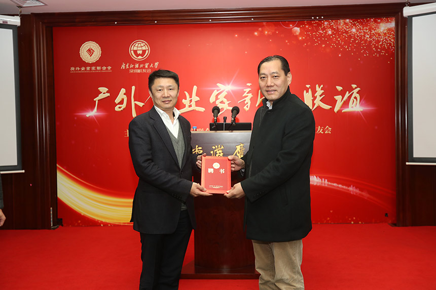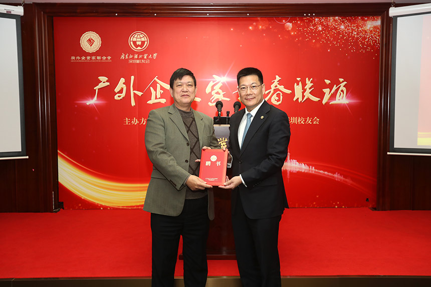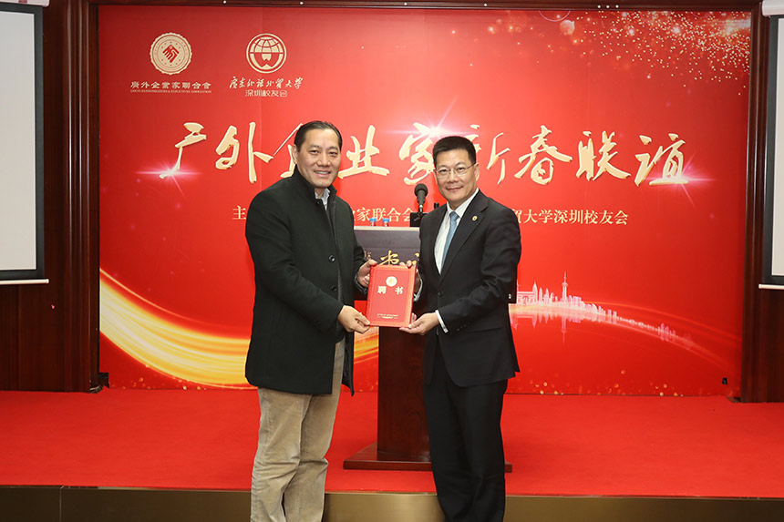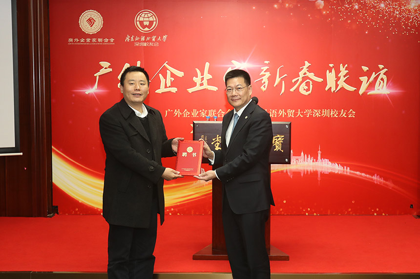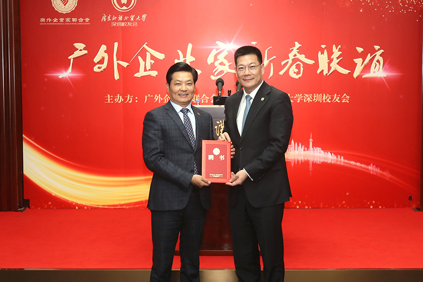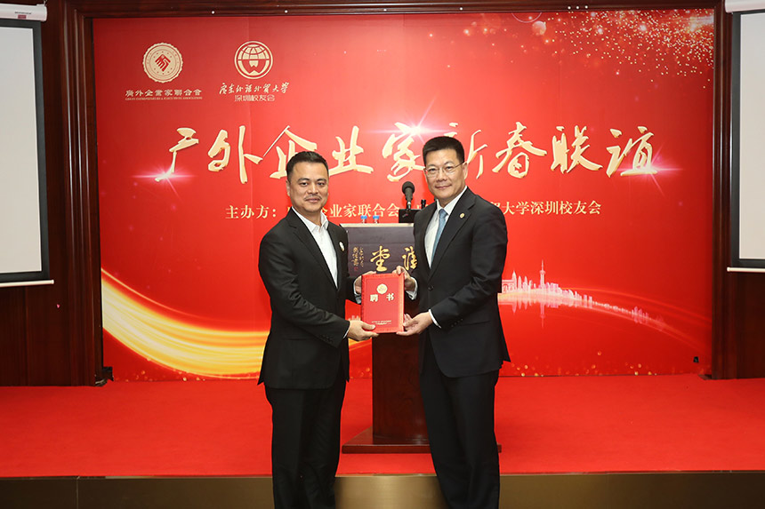 新春聯(lián)誼會上,廣東外語外貿(mào)大學(xué)企業(yè)家聯(lián)合會聘書頒發(fā)儀式拉開帷幕,廣東外語外貿(mào)大學(xué)企業(yè)家聯(lián)合會成立于2016年11月,旨在弘揚(yáng)明德尚行的廣外精神,為校友企業(yè)搭建全方位、高端、權(quán)威專業(yè)的服務(wù)平臺,提供政策解讀,戰(zhàn)略定位,商務(wù)咨詢,宣傳報(bào)道,投融資咨詢,制度管理培訓(xùn)等創(chuàng)新性、務(wù)實(shí)性、多元化的服務(wù)與支持。建立共建、共享、共贏的合作模式,促進(jìn)企業(yè)發(fā)展和價(jià)值提升,共同為社會的建設(shè)和發(fā)展貢獻(xiàn)力量。